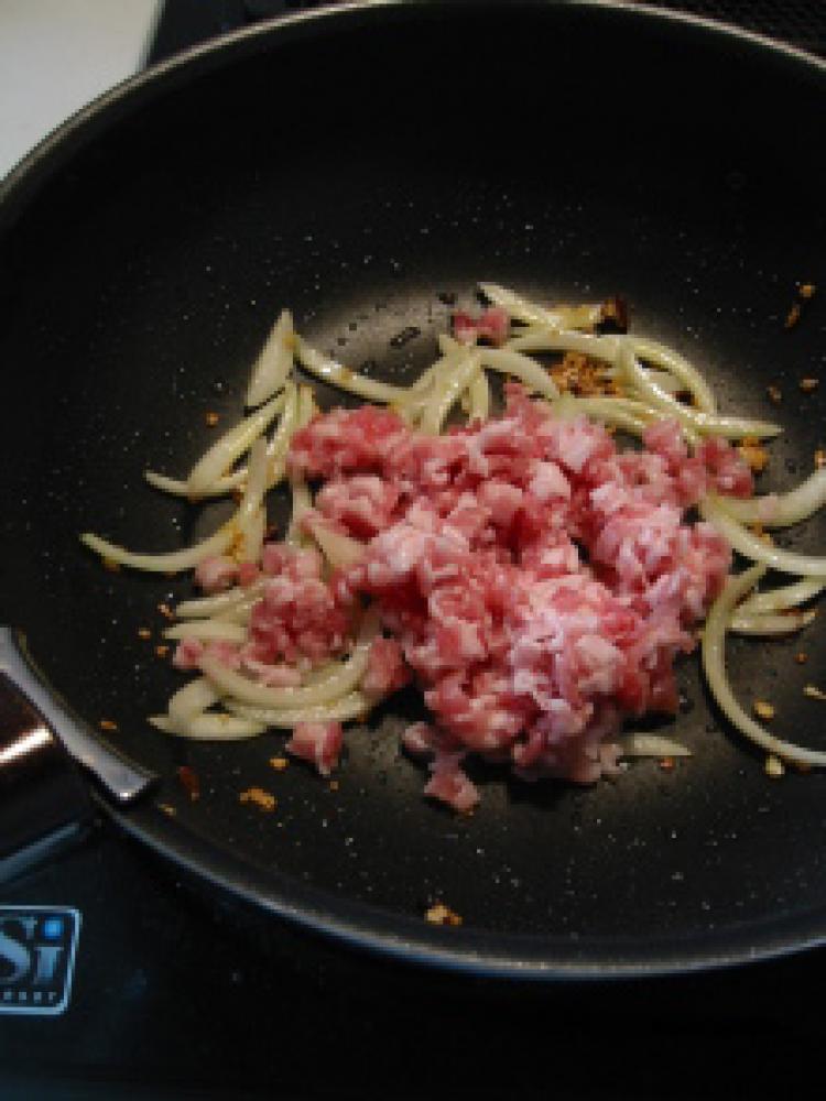 ![]() 玉ねぎがしんなりしてきたらひき肉を投入し、焼き目が付くくらいしっかり火を通します。