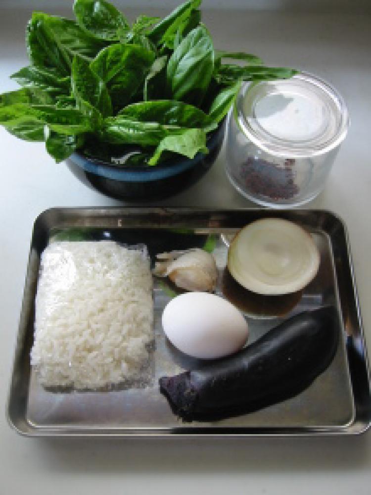 ![]() 下準備:玉ねぎは5mm薄切り、ナス1.5cmの角切り、にんにくはみじん切りにする。