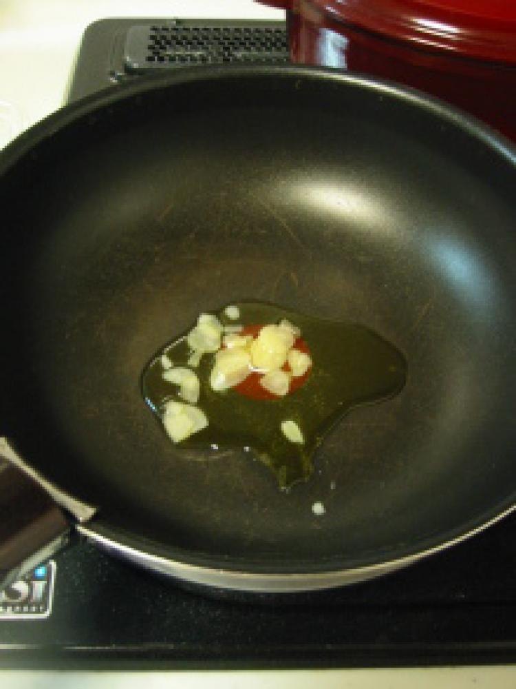 ![]() フライパンにオリーブ油とにんにくを入れて弱火で熱します。