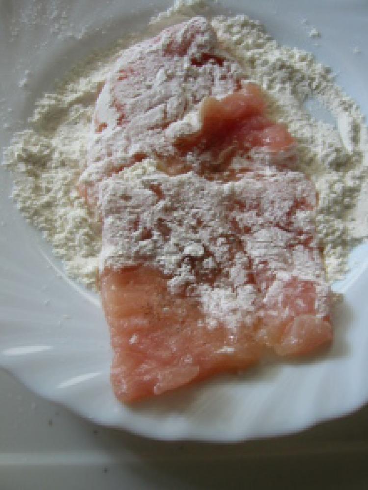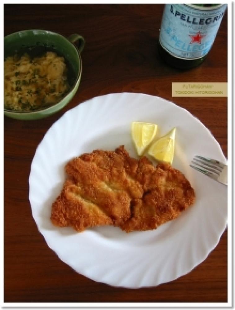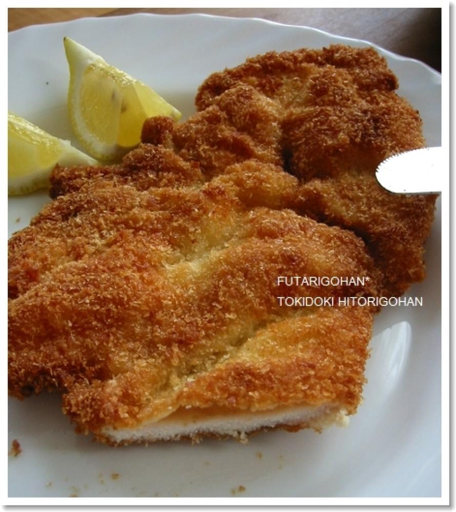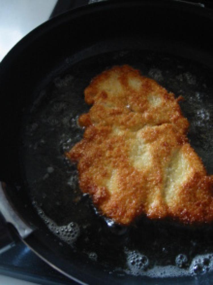 ![]() 小麦粉→溶き卵→パン粉の順にまぶします。