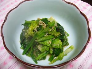 フライパンにごま油を熱し、じゃこを炒める。じゃこに油がなじんだら、小松菜を入れさらに炒める。