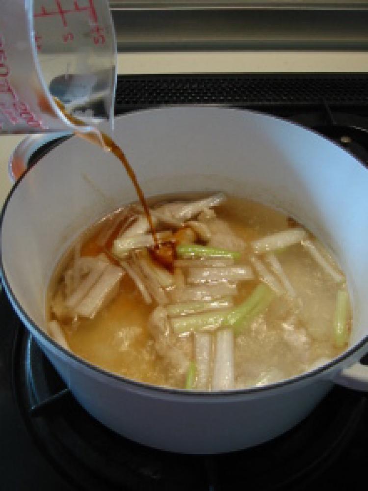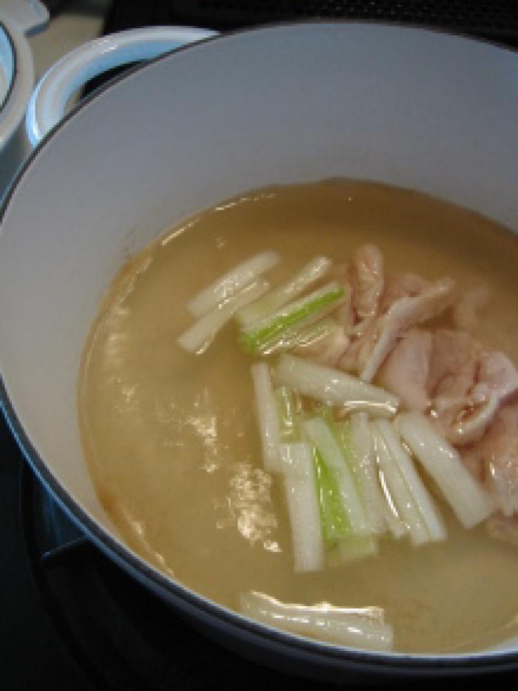 ![]() 湯を沸かしたら顆粒だし、白ネギ、鶏肉を加えて火を通します。