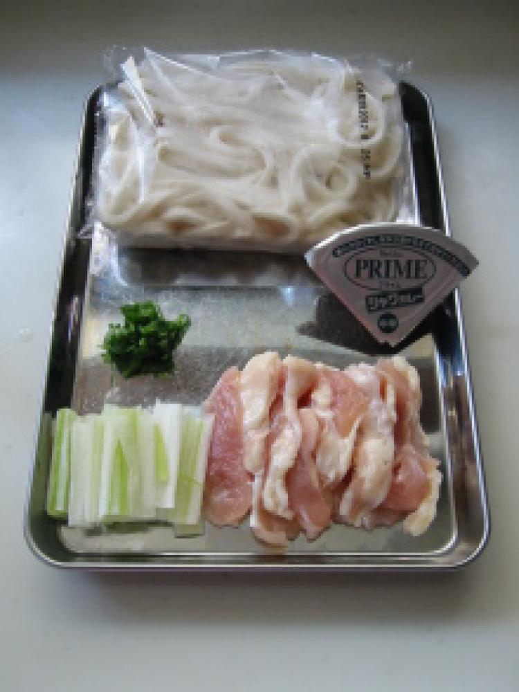 ![]() 下準備:鶏胸肉はそぎ切り、長ネギの白い部分は短冊、青い部分は輪切りにする。