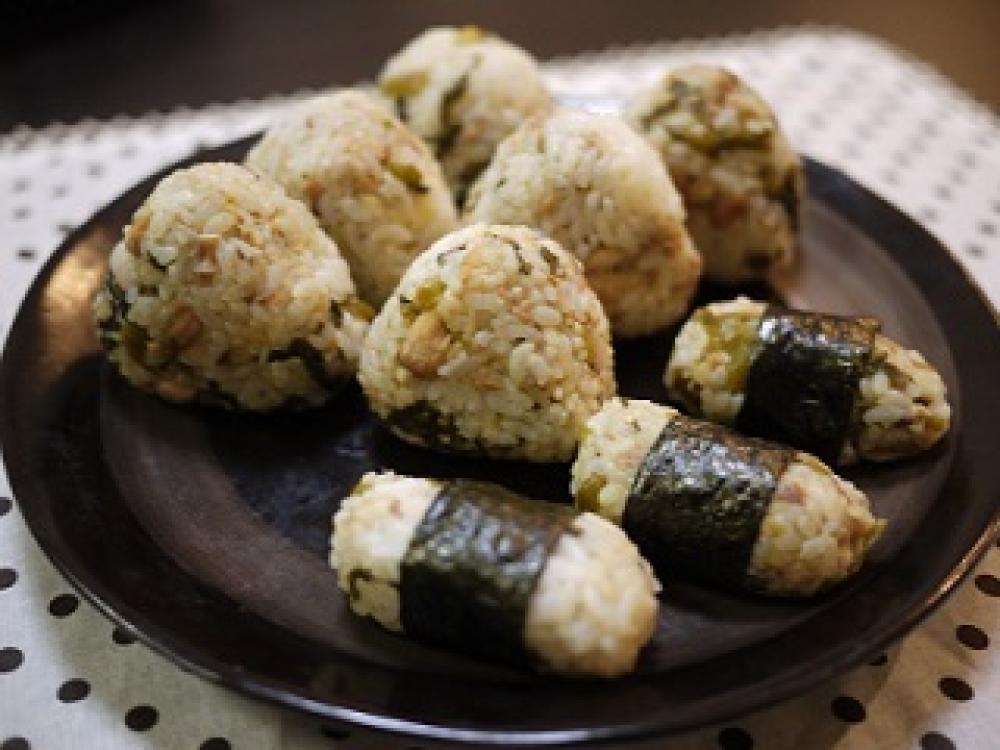 さば缶の汁を切り、温かいごはんに全ての材料を混ぜ合わせ、ラップで握る。