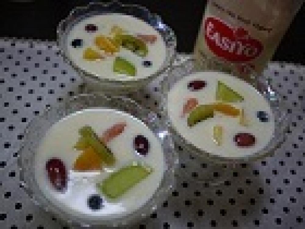 ![]() 2にヨーグルトを加え均一に混ぜ、水気をとったカットフルーツを混ぜわせ、器に入れ冷蔵庫で30分冷やし固める。
