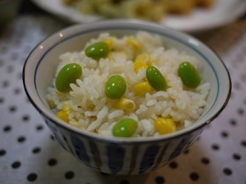 生とうもろこしの実を、包丁で削り米の上にのせる。芯も甘味が出るので入れちゃいました!