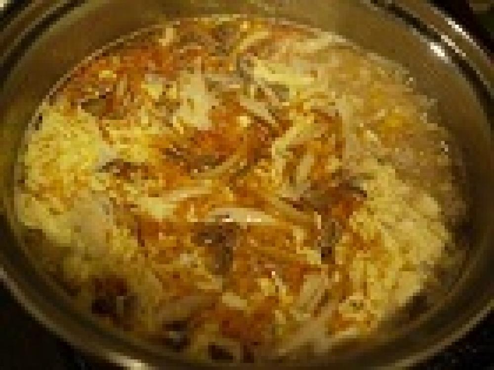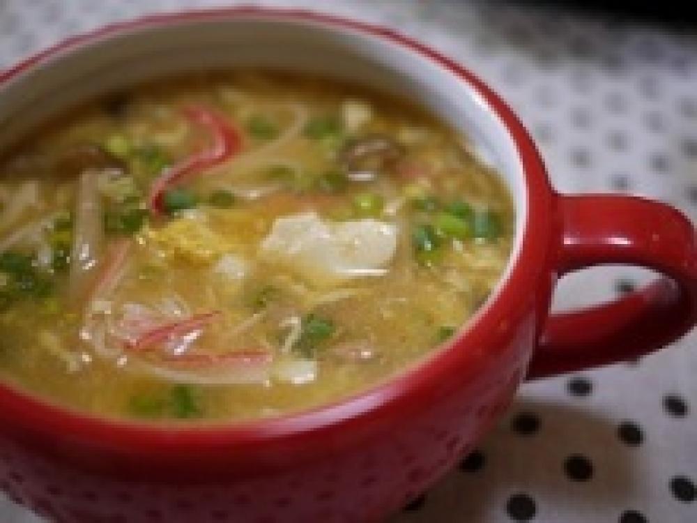 ![]() 1に水・ダシダを入れ沸騰させ、合わせ調味料Aを入れ再び沸騰したら水溶き片栗粉を入れ、溶き卵を流しいれる。
