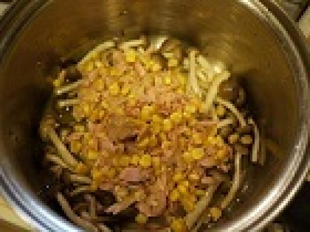 ![]() 鍋を熱しごま油を入れしめじを炒め、ツナコーンを入れる。