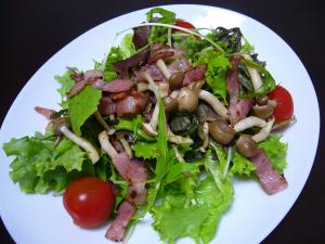 お皿に①の葉類をひろげ、③のベーコンとしめじをのせる。