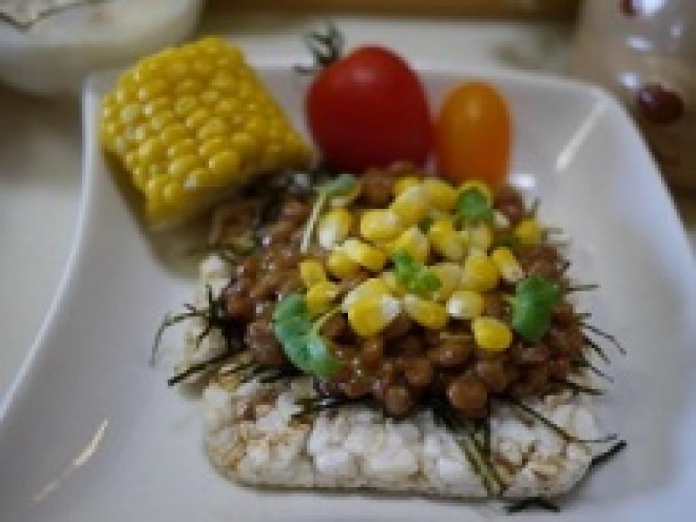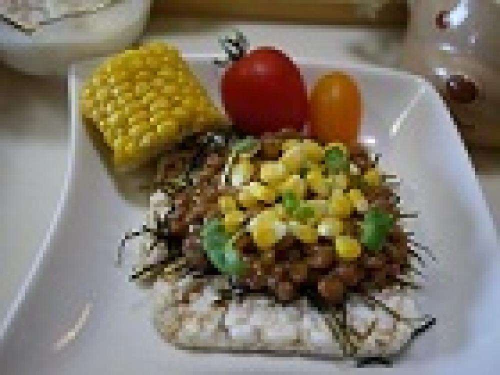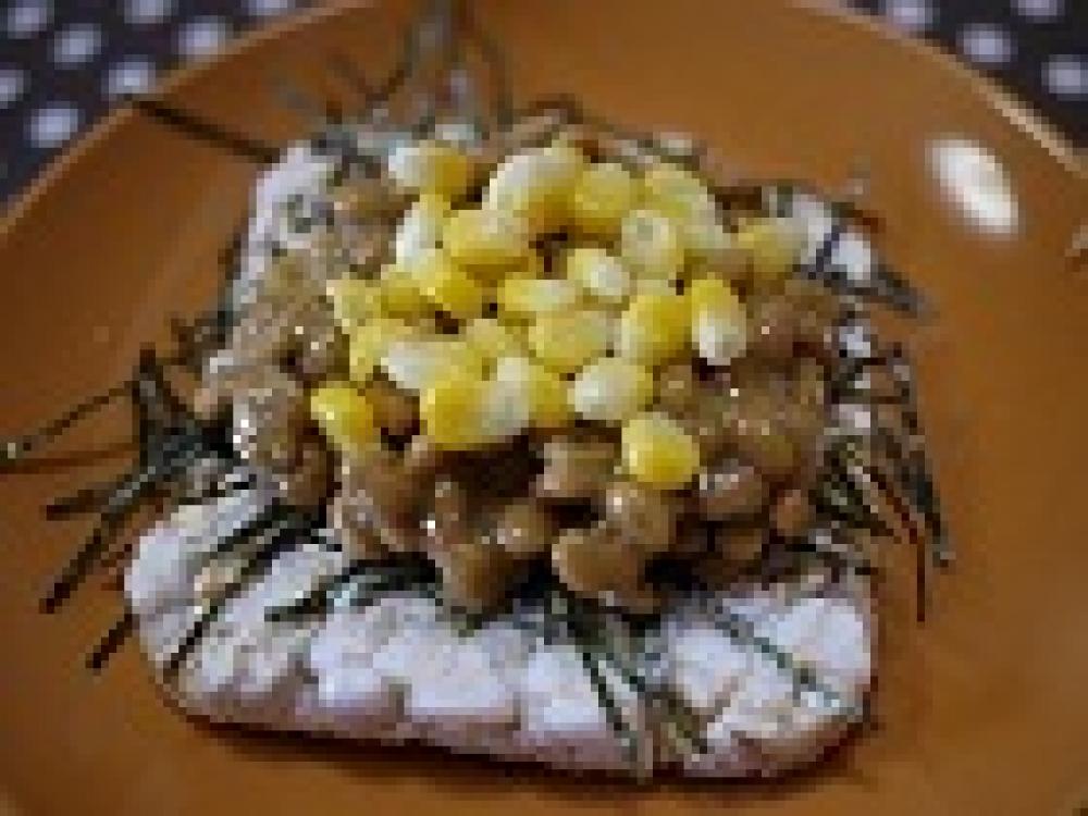 ![]() 雑穀畑に刻み海苔・かき混ぜた納豆・コーンをのせる。