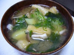 熱湯をまわしかけた油揚げ・しめじ・わかめをいれ、煮立ってきたら、みそを加え、沸騰直前まで温める。