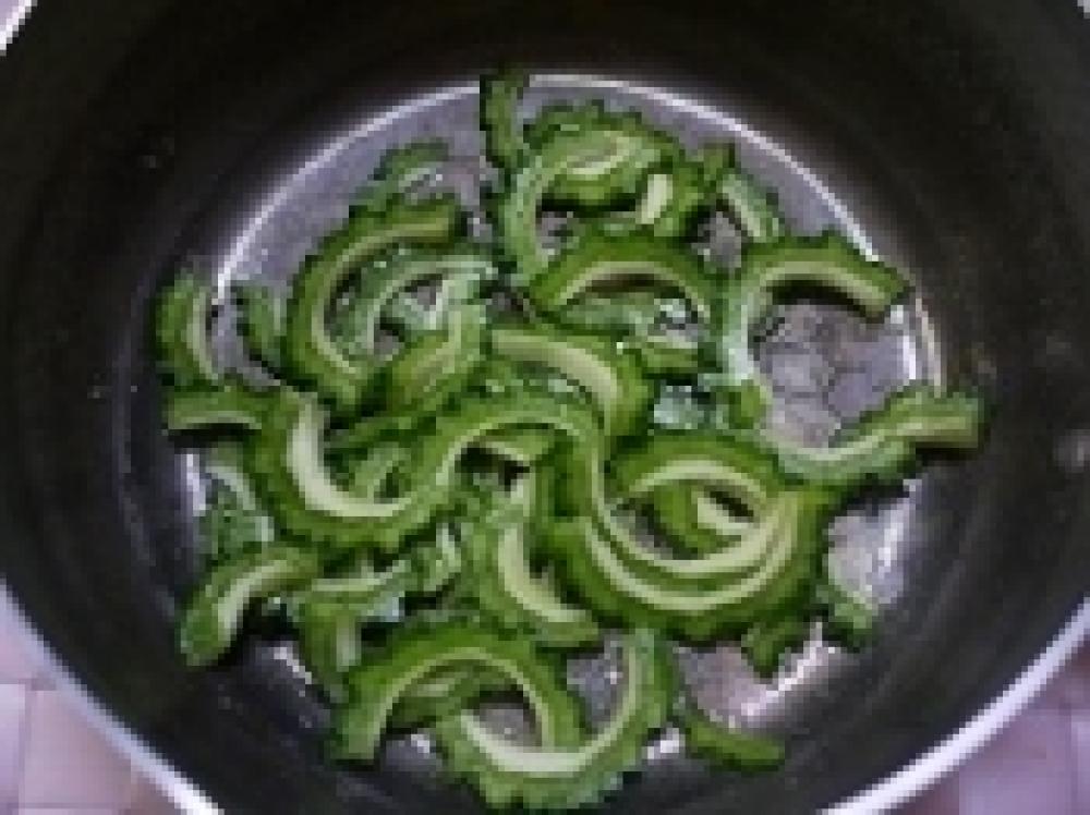 ![]() ゴーヤはワタをスプーンで取り3㎜幅にスライスして塩をしてしばらく放置し、さっと洗い水気を切っておく。