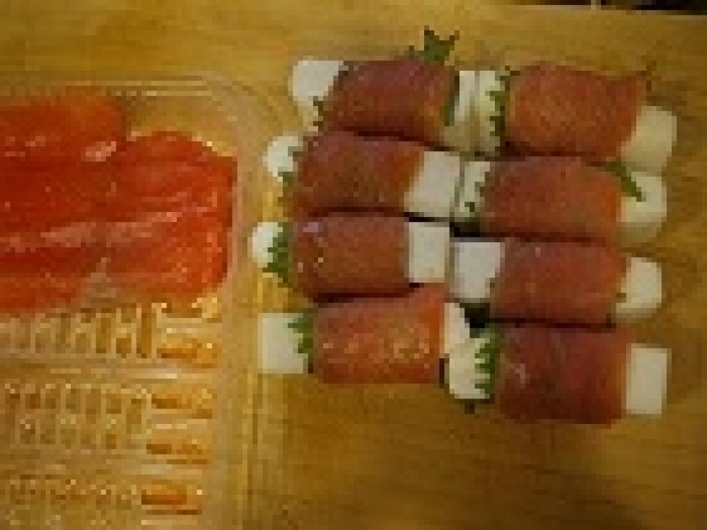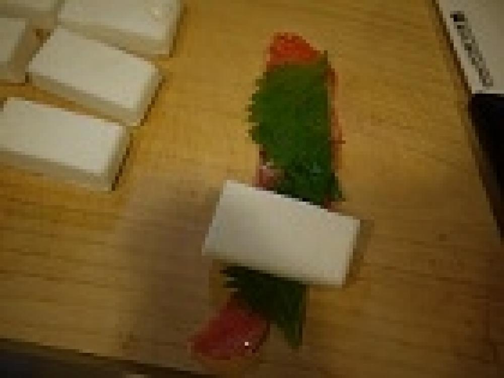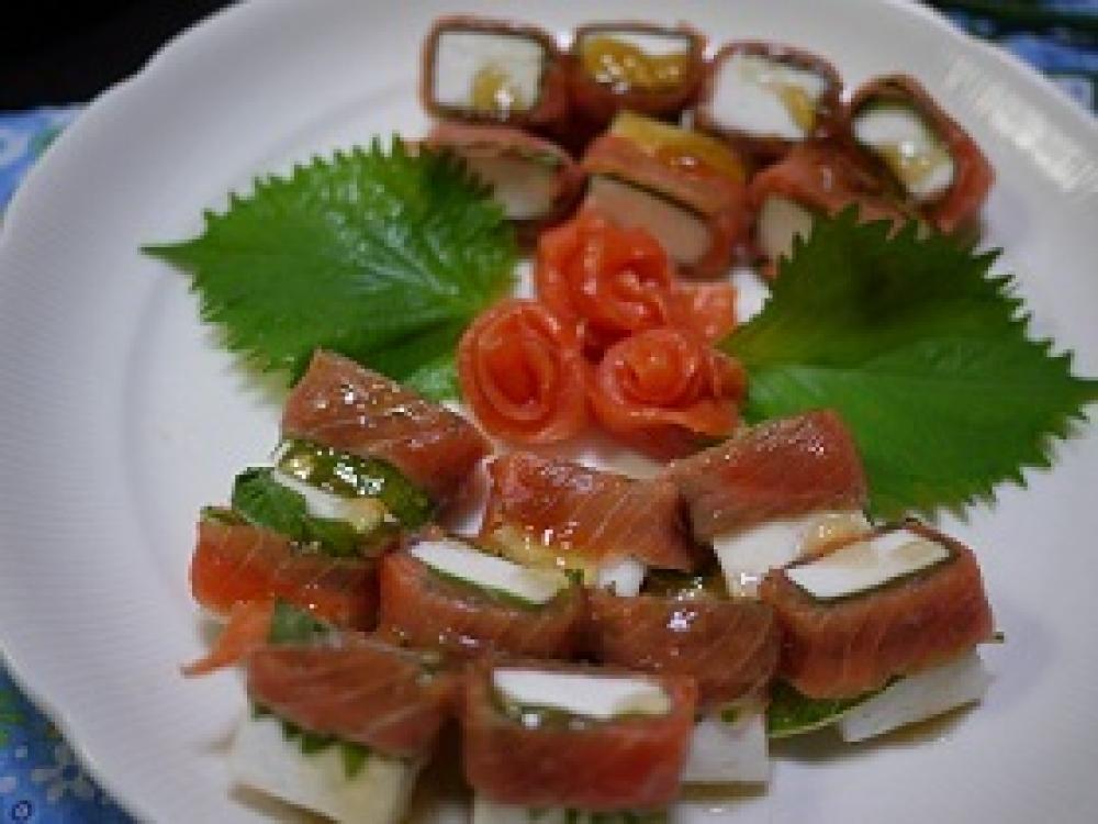 ![]() サーモンの上に縦に切った大葉をのせ、1のはんぺんをのる。