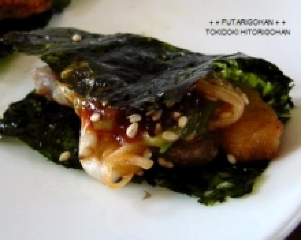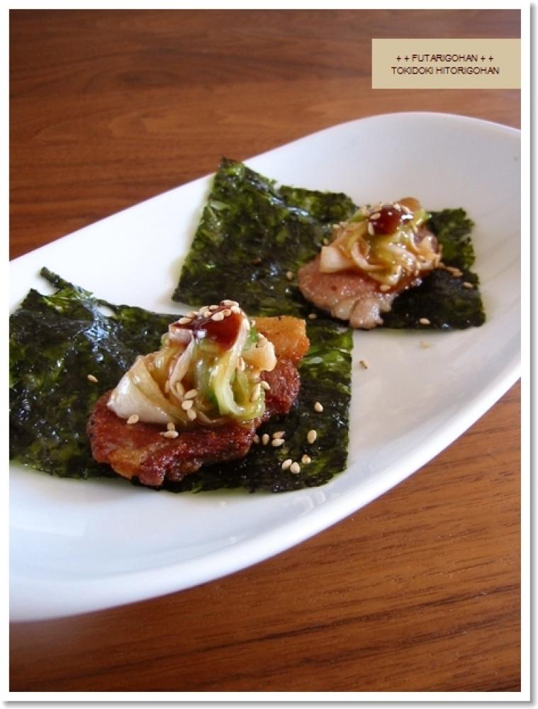 ![]() 韓国海苔にのせ、味付けしたネギをトッピングして完成です☆