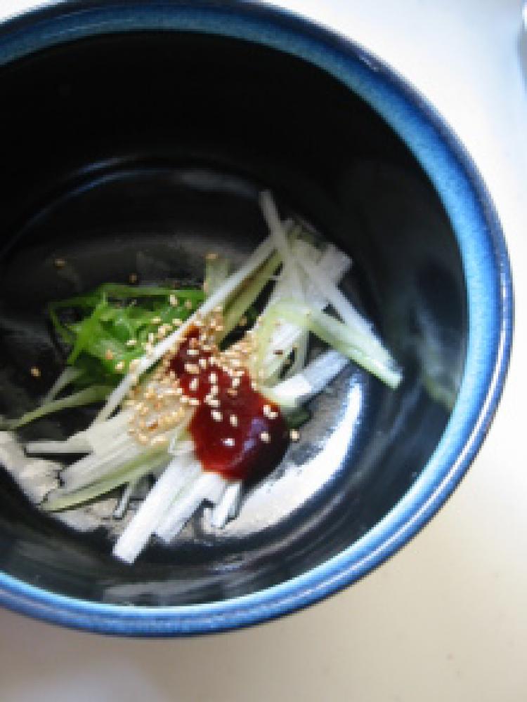 ![]() 下準備:長ネギを細切りにして、(A)の調味料と合わせておく。