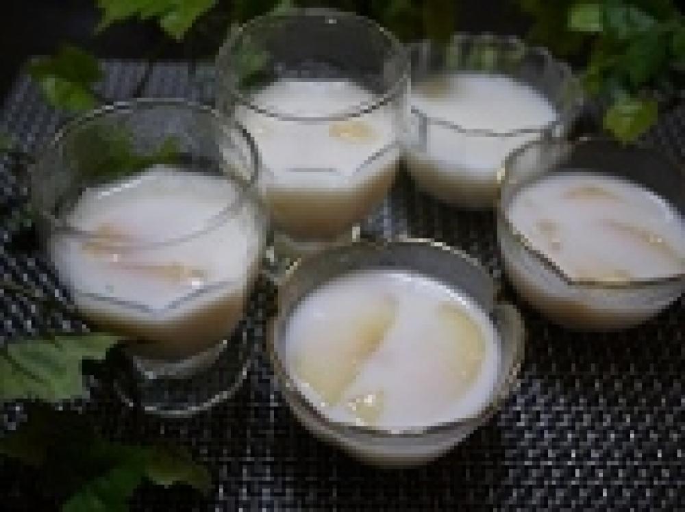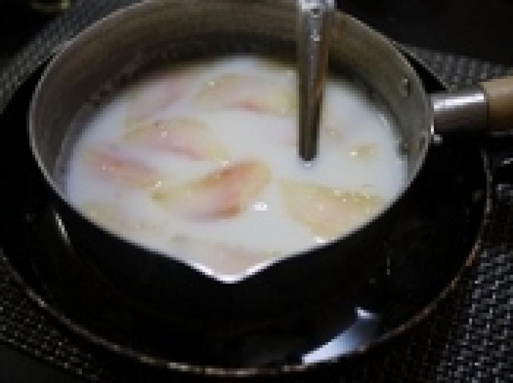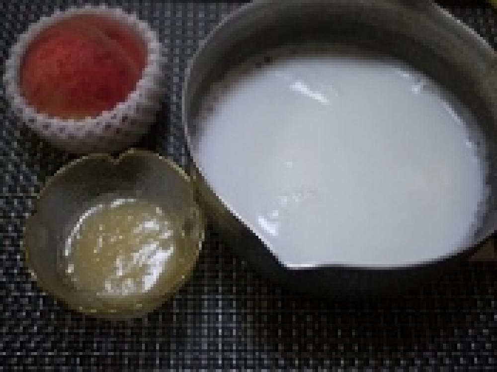 水を沸騰させ、砂糖を入れ牛乳を足し、火を消しふやかしたゼラチンを入れかき混ぜる。 |