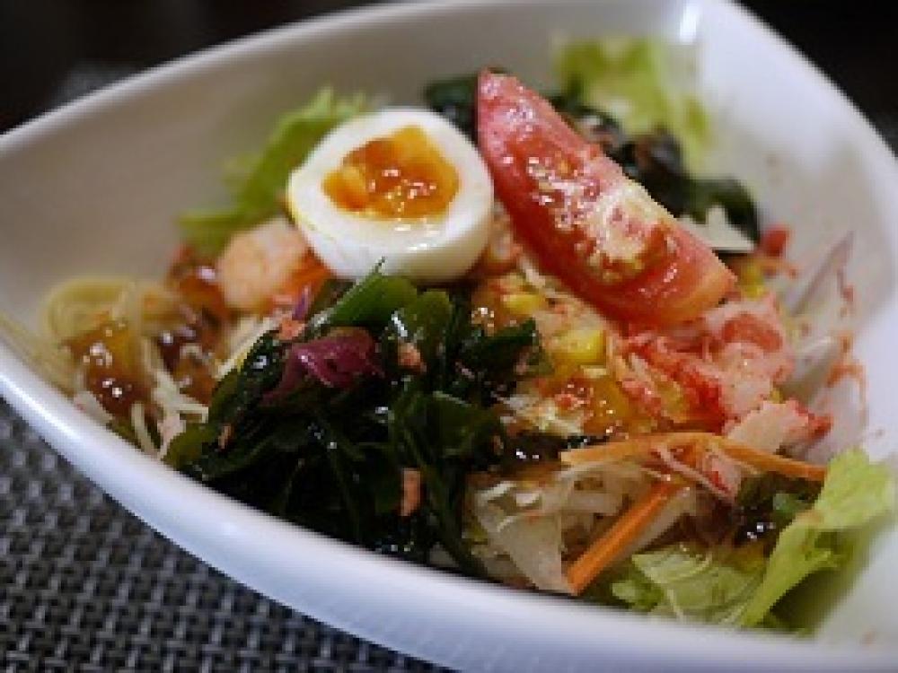 ![]() 好きな野菜や海草をのせ凍ったトマトをすりおろす。