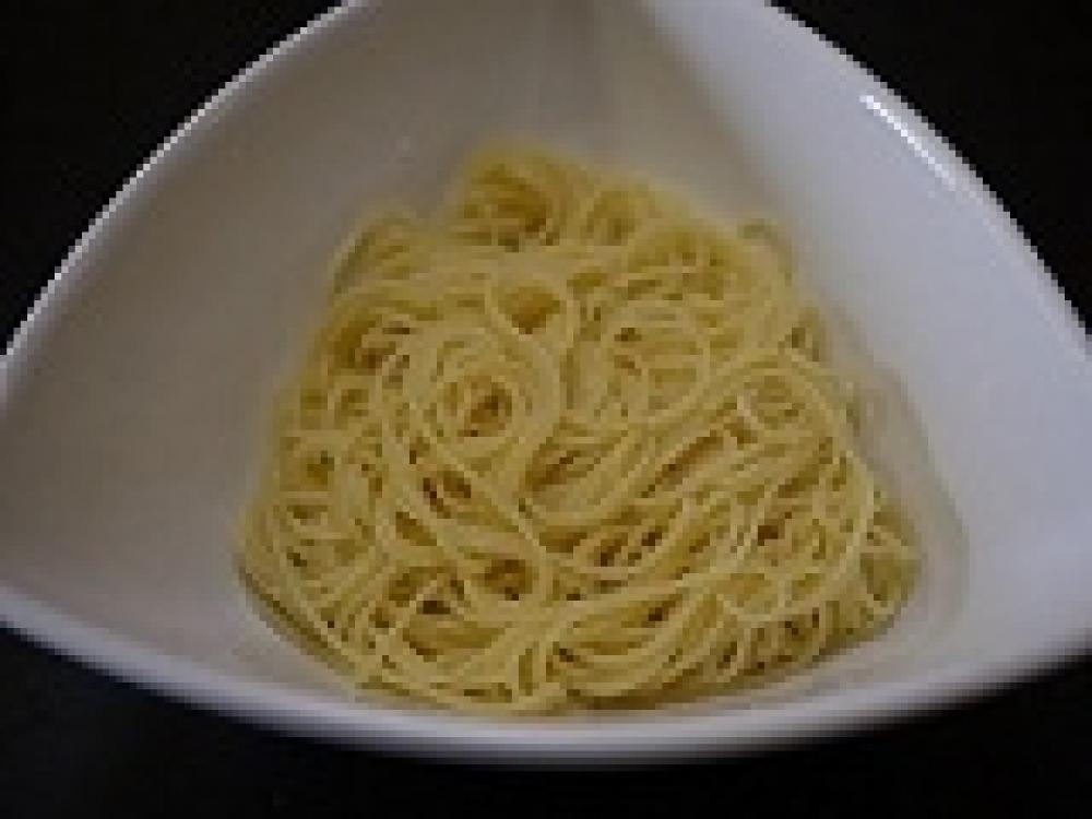 ![]() たっぷりのお湯に塩を入れ袋の裏の茹で時間より1分多く茹で、冷水で冷やし水気を切って器にもりつける。