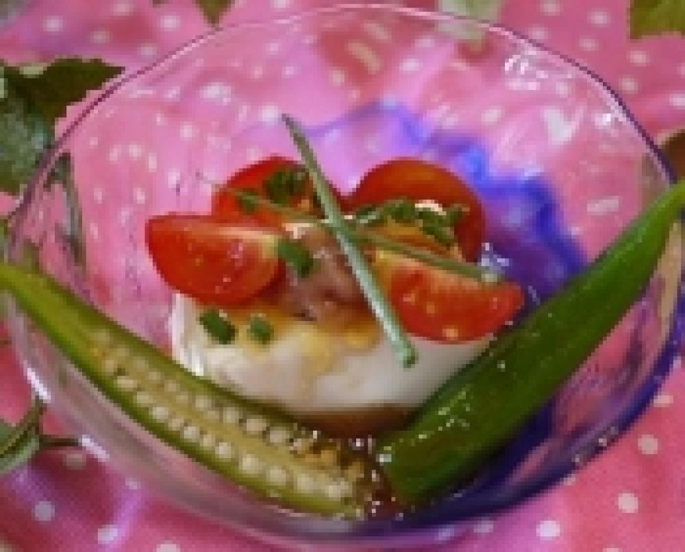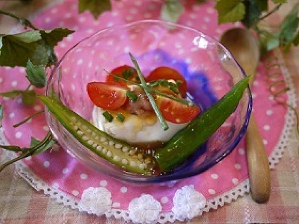 ![]() 万能ねぎは小口切りにし、ミニトマト・オクラの漬物は好きな形に切り、盛り付ける。