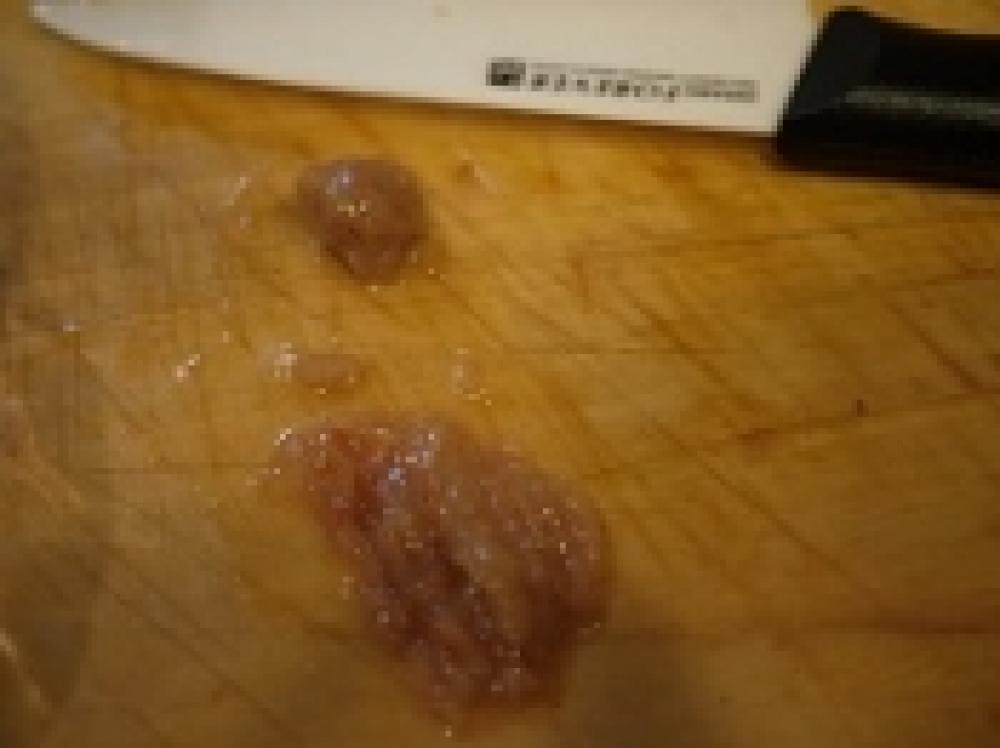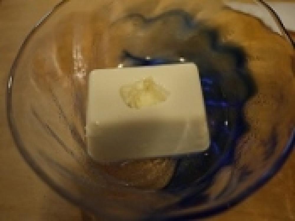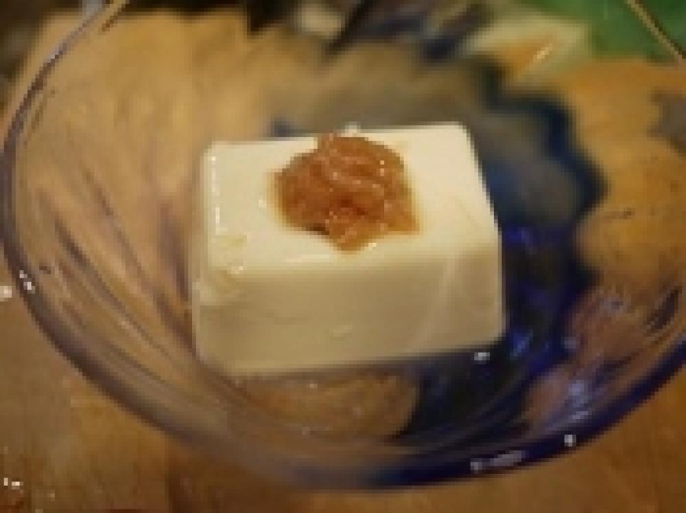 ![]() 豆腐の中央をスプーン等でくり抜く。(梅干しが入るくらい)