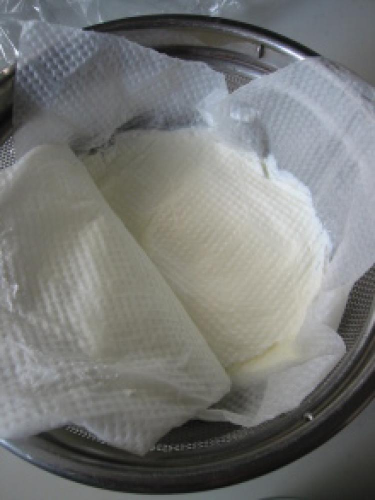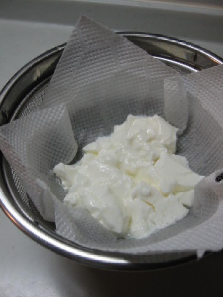 ![]() 下準備:キッチンペーパーを引いたザルにプレーンヨーグルトを入れて、ボウルの上にのせたら一晩冷蔵庫で水切りをする。