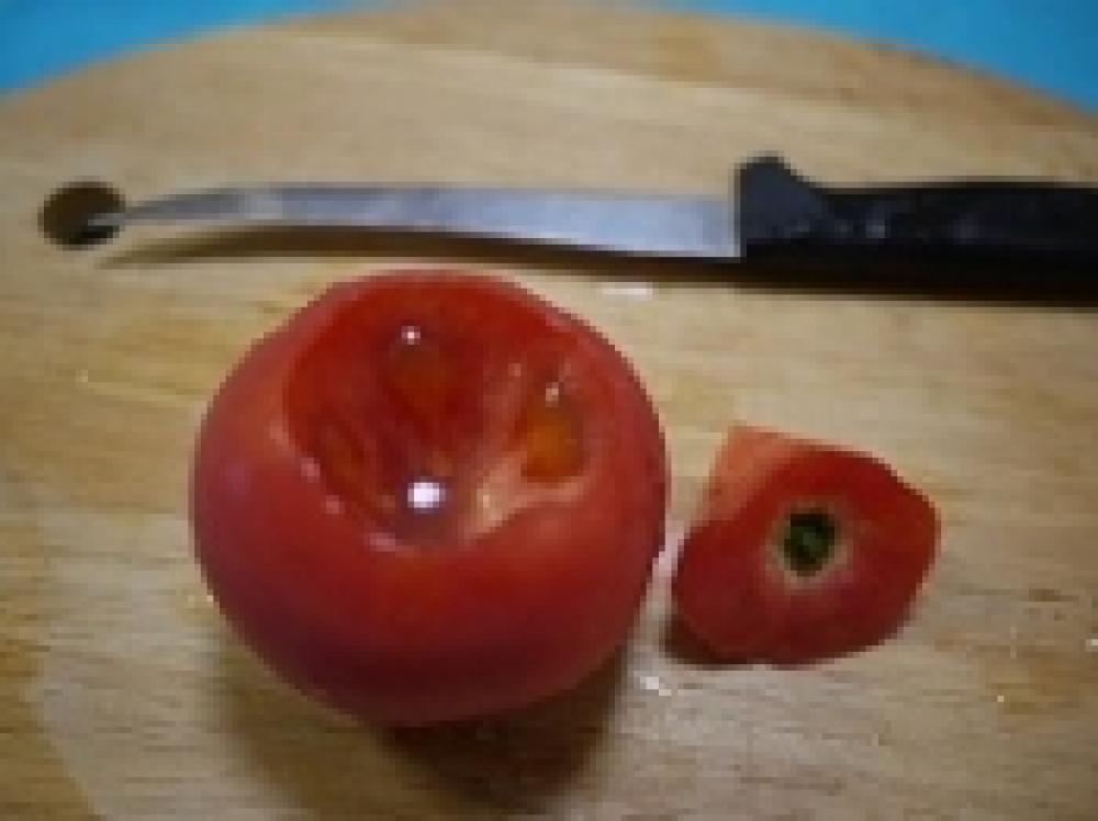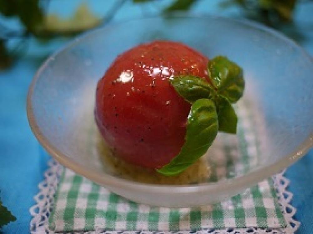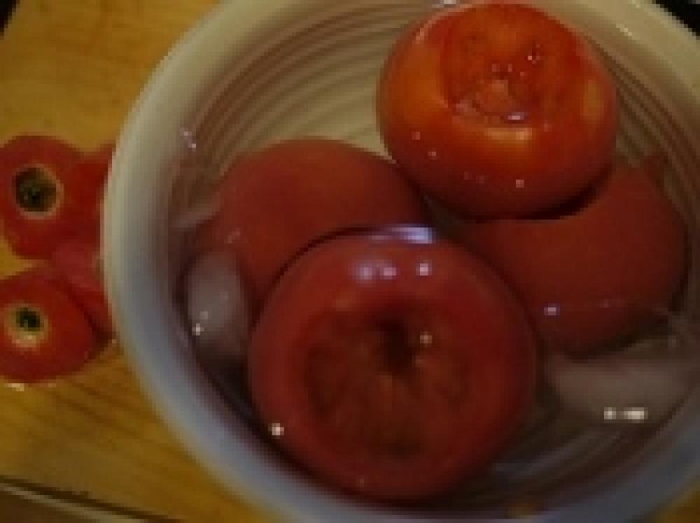 ![]() 沸騰したお湯の中にトマトを入れ皮が割れてきたら、取り出す。