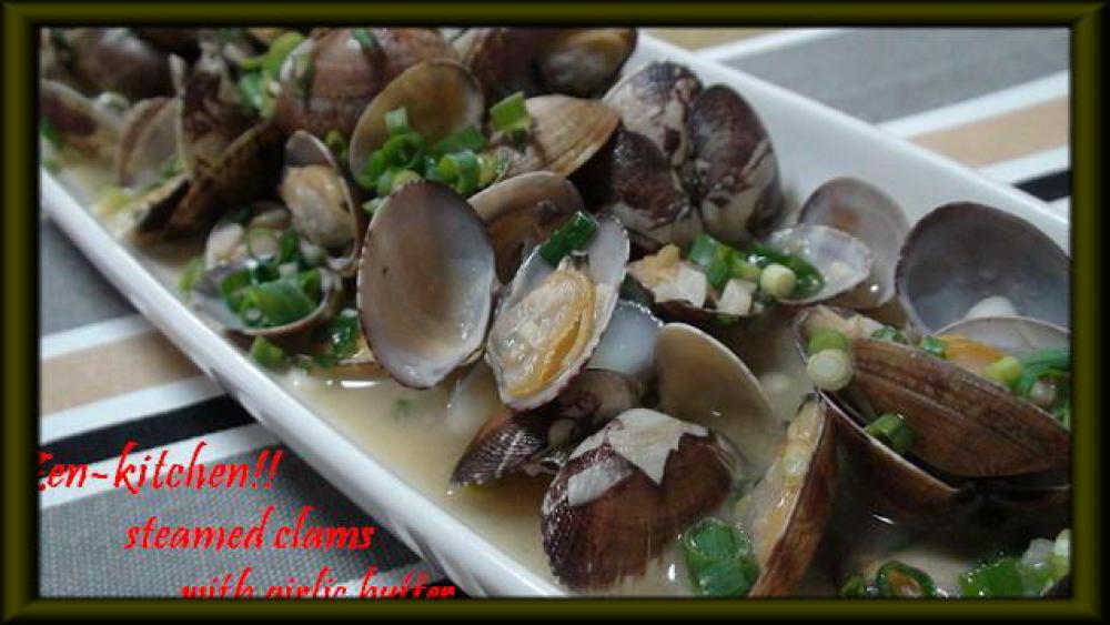 殻が開いたら、醤油をまわし入れます。お皿によそって、刻みネギをかけて出来上がり