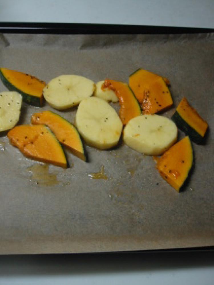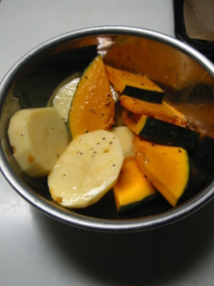 ![]() オーブンの余熱を開始したら、じゃがいも、かぼちゃに塩こしょうしオリーブオイルをまぶします。