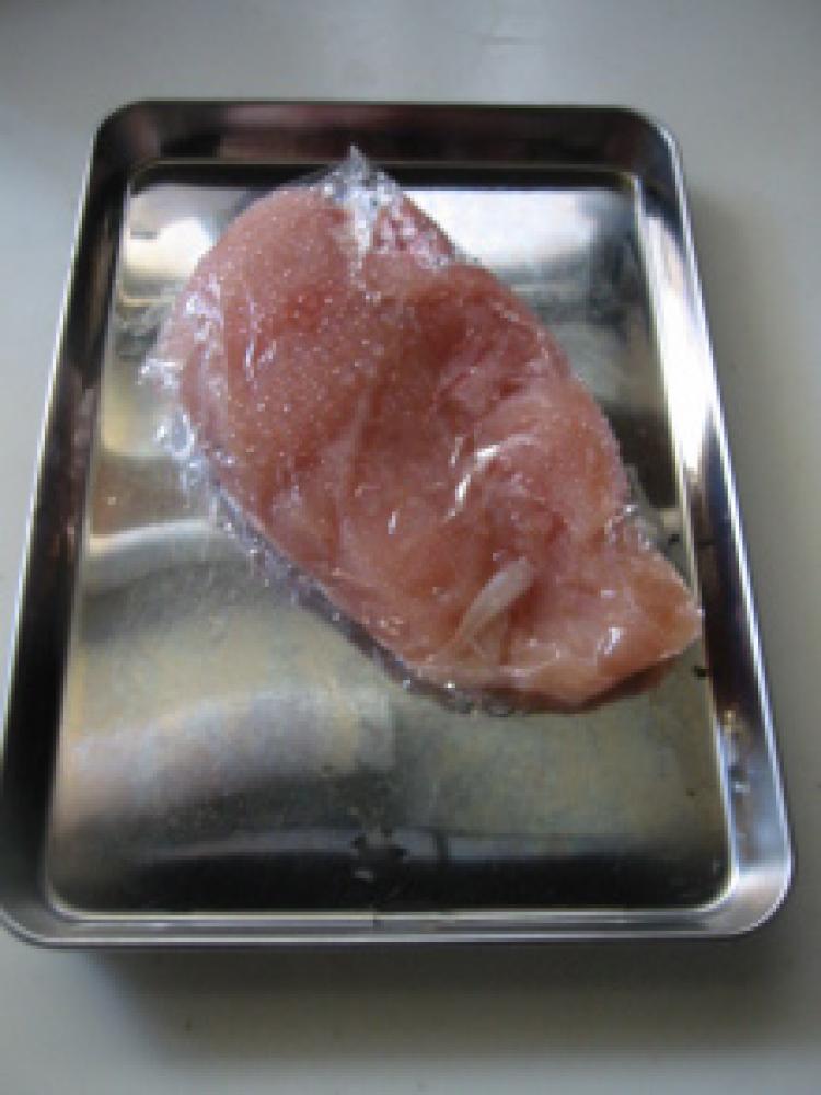![]() 下準備①:鶏胸肉は厚い部分を開いてからフォークなどでプスプスと穴をあける。