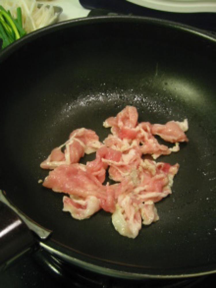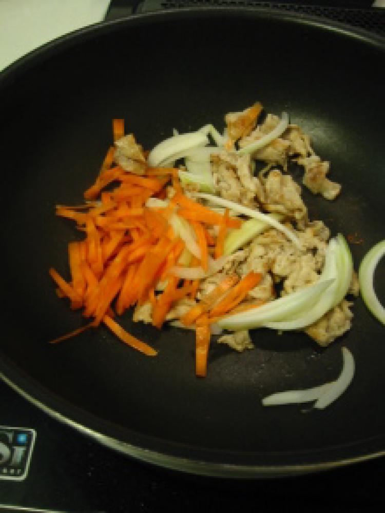 ![]() 豚肉の色が変わったところで、人参と玉ねぎを加え軽く塩こしょうしましょう。
