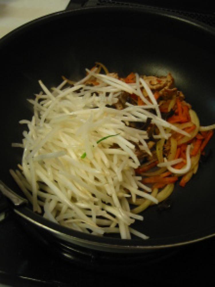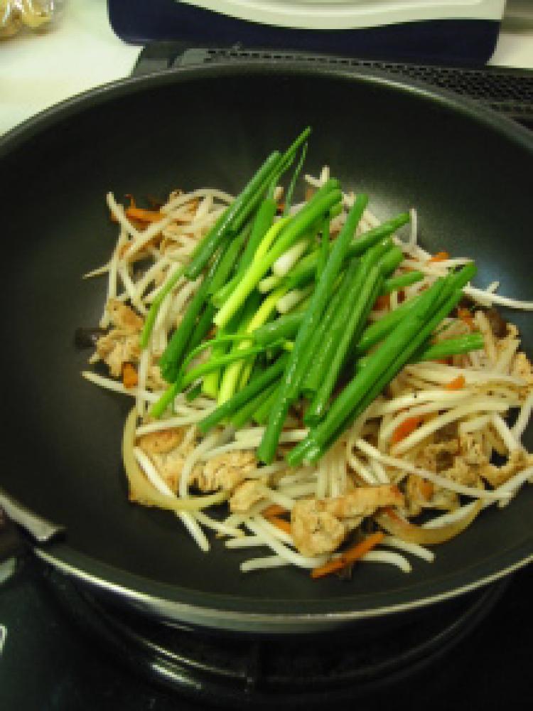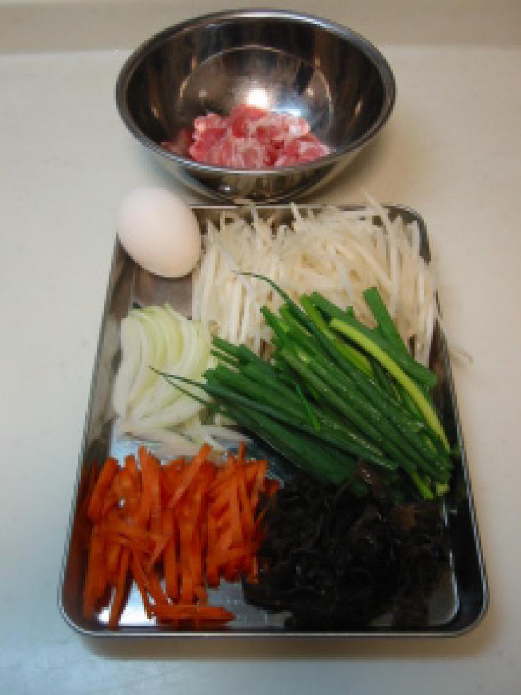 ![]() 下準備:豚こま肉は2cm幅にカット、もやしはひげ根を取り、(A)野菜は細切りにする。万能ねぎは4等分の長さに切る。
