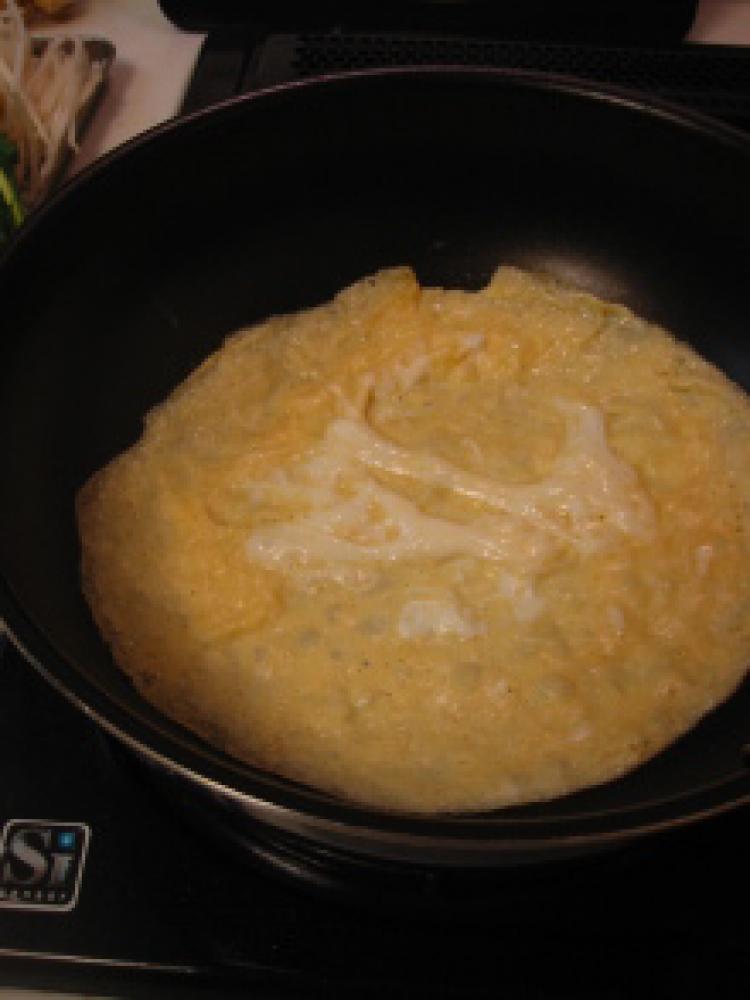 ![]() ごま油を熱して卵液を薄焼きにしたら、皿に出しておきましょう。