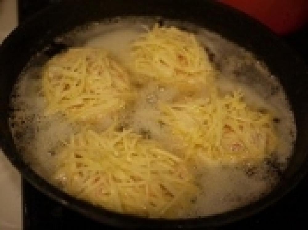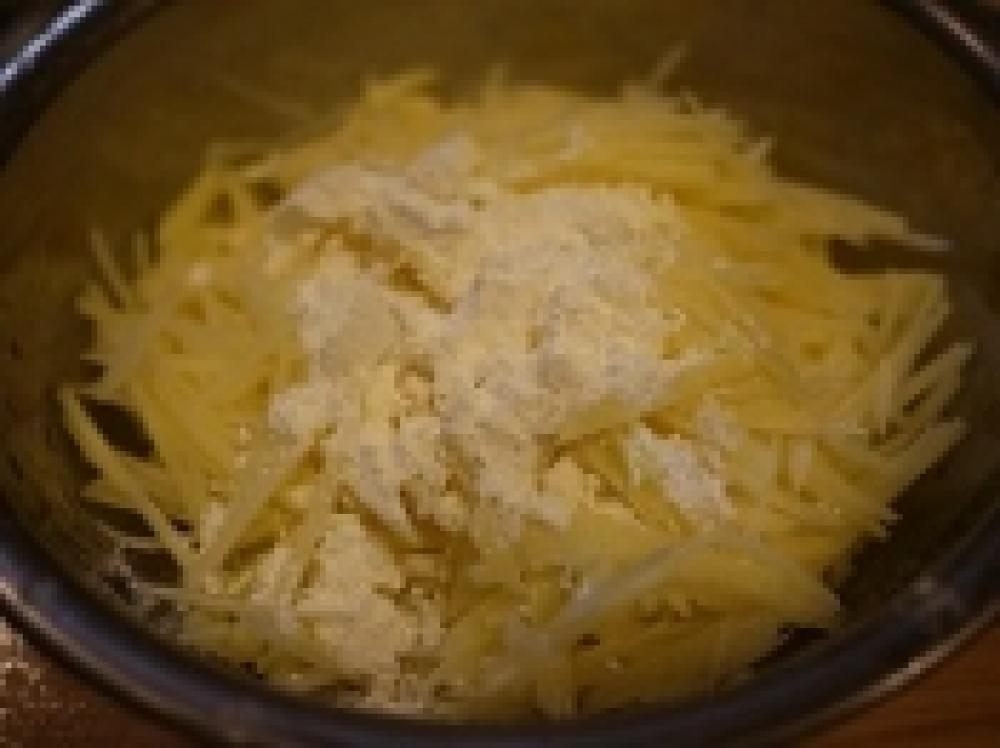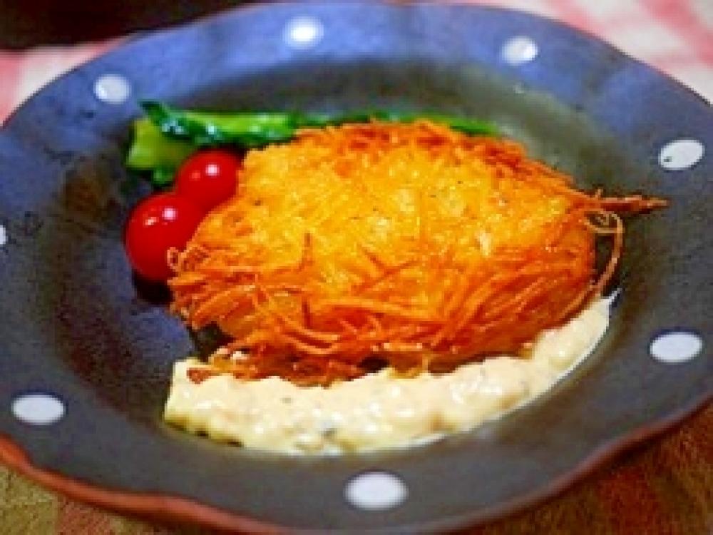 ![]() じゃが芋をスライサーでスライスして、包丁で千切りにする。