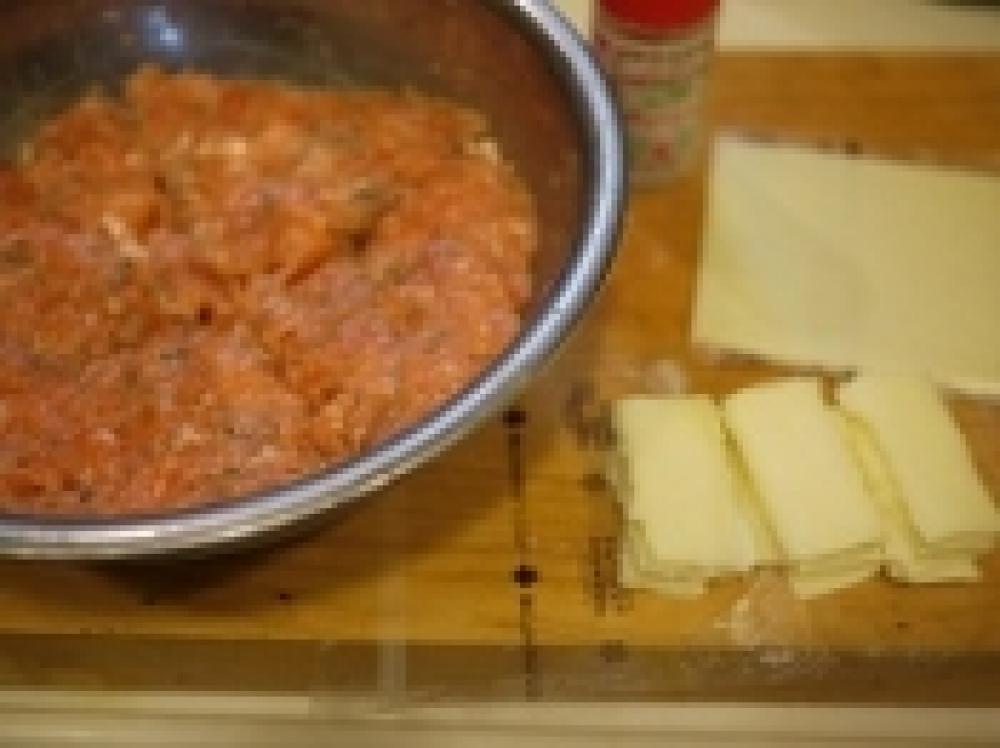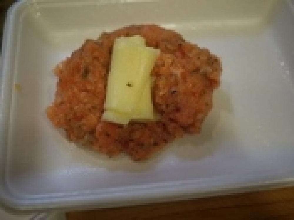 ![]() 良く混ぜ合わせたら、4等分にし、とろけるスライスチーズを小さくたたむ。