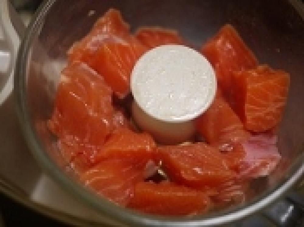 ![]() ノルウェーサーモンを一口大に切りフードプロセッサーに入れる。