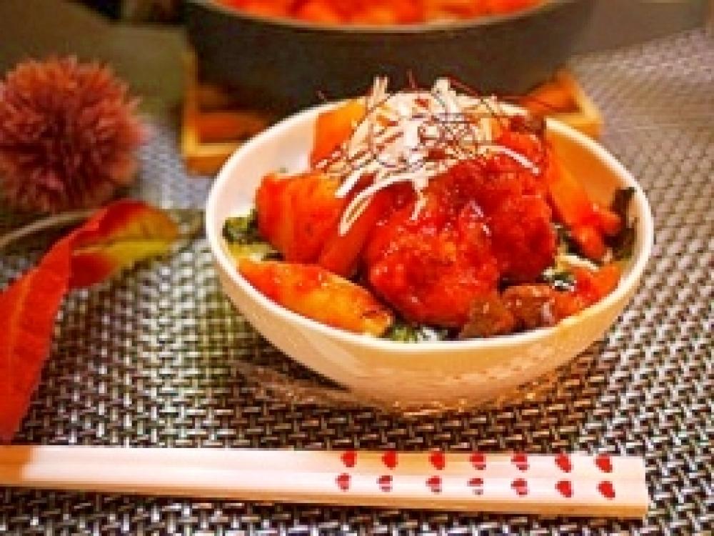 茶碗にごはんを入れ韓国海苔をちぎってのせ、4をのせて完成です!