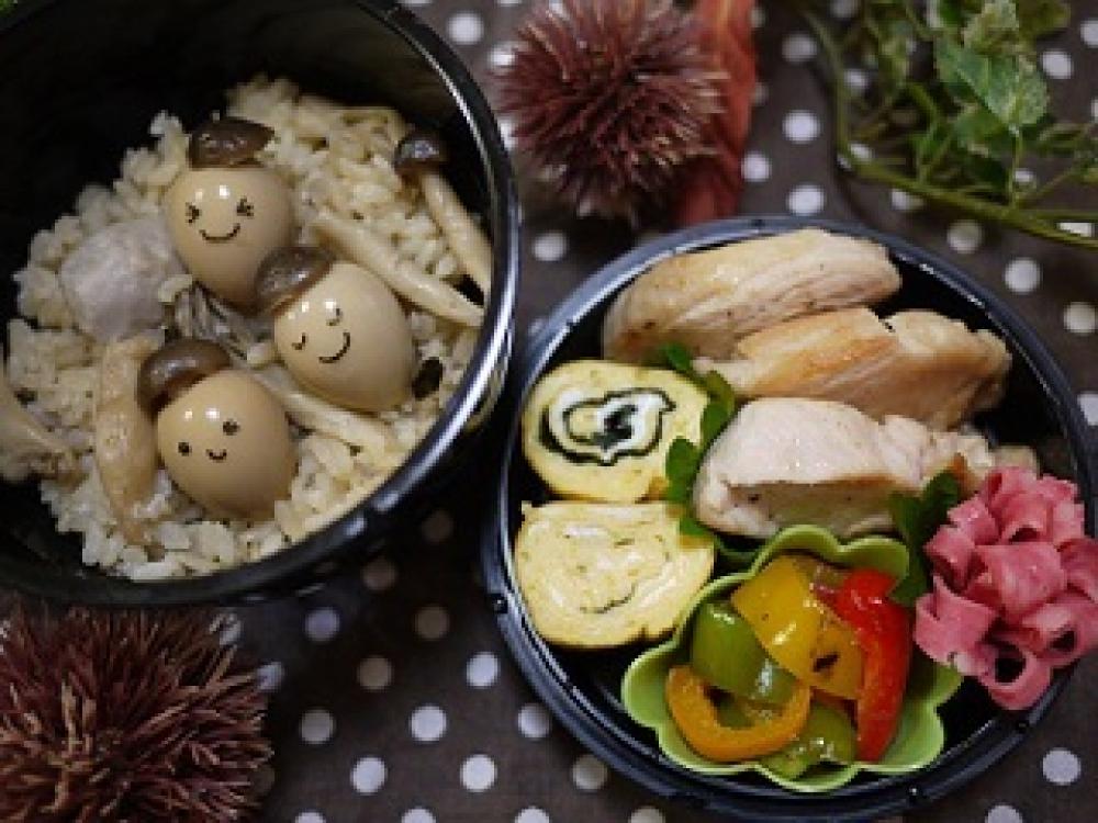 しめじはごはんのしめじの大きそうなかさを見つけて、乾燥パスタで留めてあります。