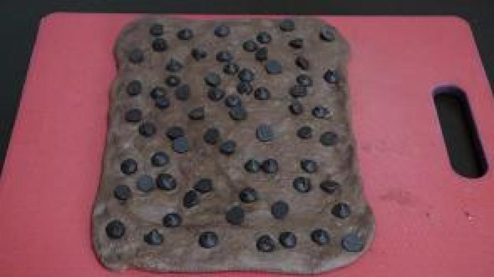 ![]() 生地を8等分して、バター(分量外)を塗った型に敷き詰めます。