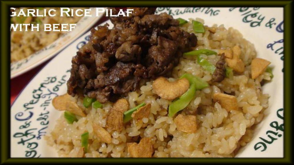 フライパンにバターを入れ、ニンニク2/3を入れて香りがでたら、牛肉100g、玉ねぎ、お米を入れて炒めます。