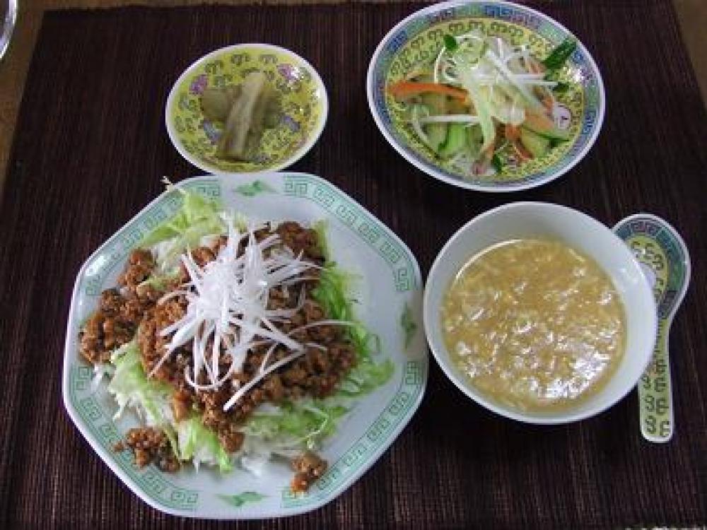 [盛り付け] ごはん→(あれば)*の千切り野菜→肉味噌→(あれば)◎をのっけます |