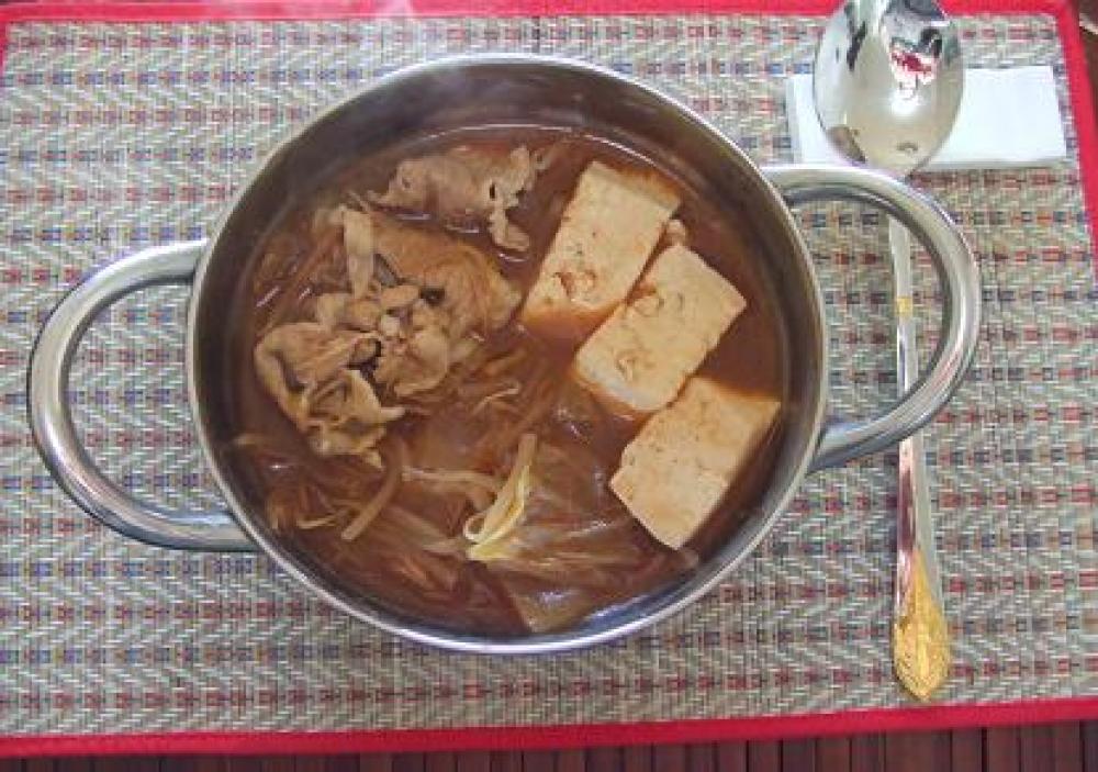 また沸騰してきたら豚肉とお豆腐を入れます。(アクをとりながら火を通します)