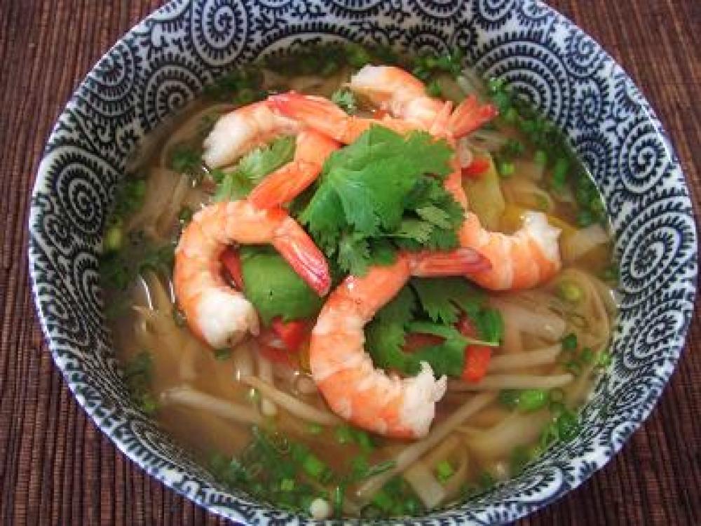 しょうがを取り除き、フォーと①の材料をスープに入れます。