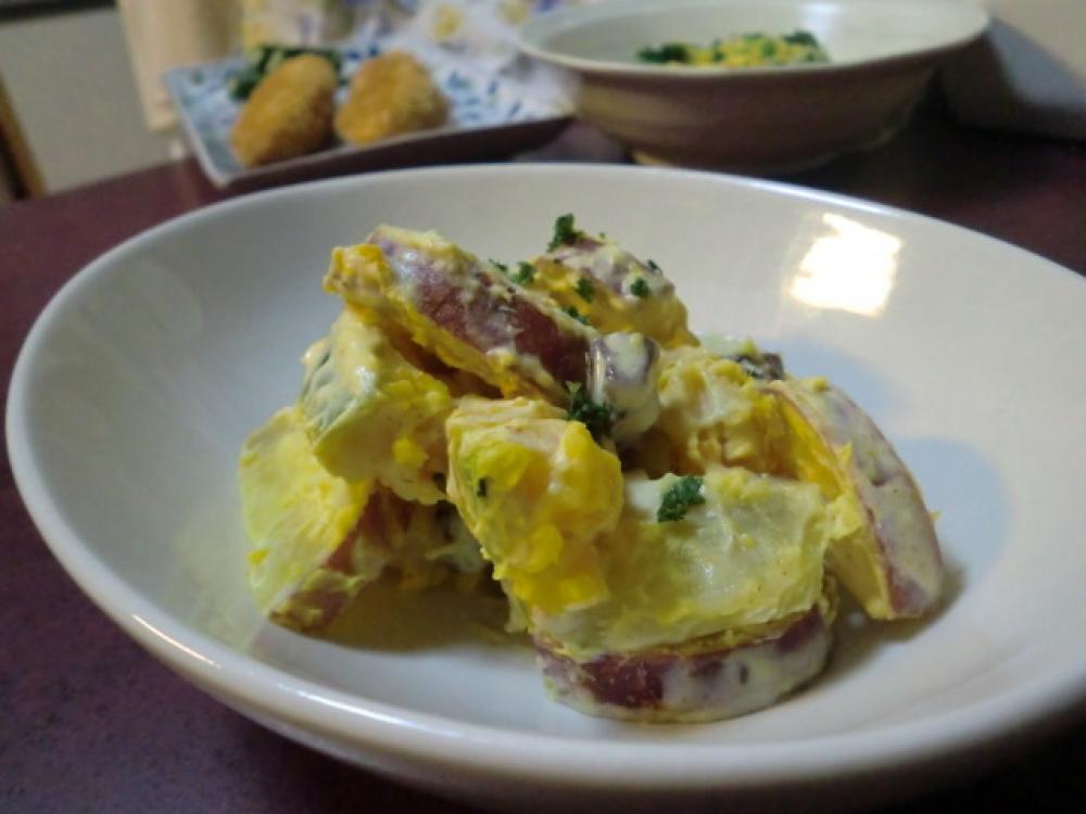 サツマイモは縦半分に切って、1cm厚さにして、水にさらして、水気を切り、カボチャと一緒に茹でます。