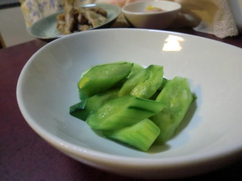 キュウリは皮をむき、包丁の背で軽くつぶしてから、食べやすい大きさに切ります。ニンニクはつぶします。