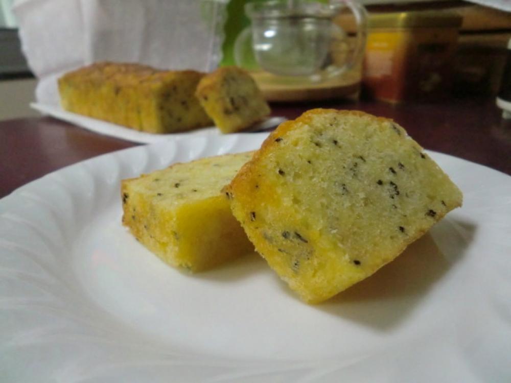 卵を1個ずつ加え、よく混ぜ合わせ、さらに刻んでおいた紅茶の葉を加えて混ぜます。