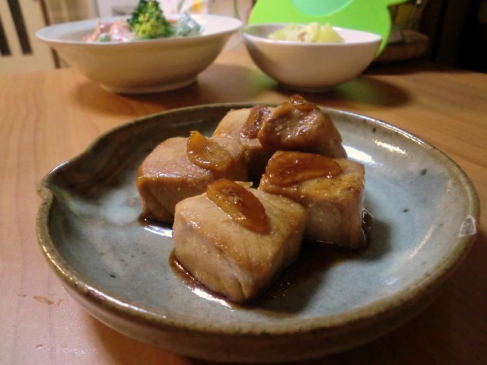 フライパンに油を熱し、1のマグロを入れて強火で表面に焼き色をつけます。