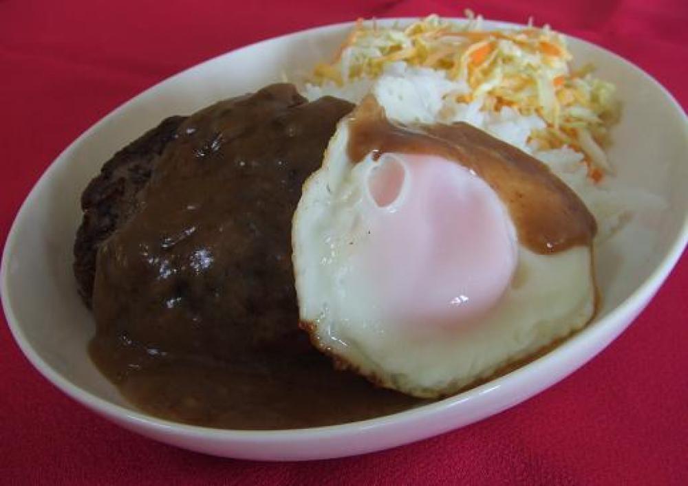 ご飯・ハンバーグ・目玉焼きをのせて(丼でも、お皿でもOK)、キャベツなど(なんでも野菜ならOKです)を添えて、グレイビー