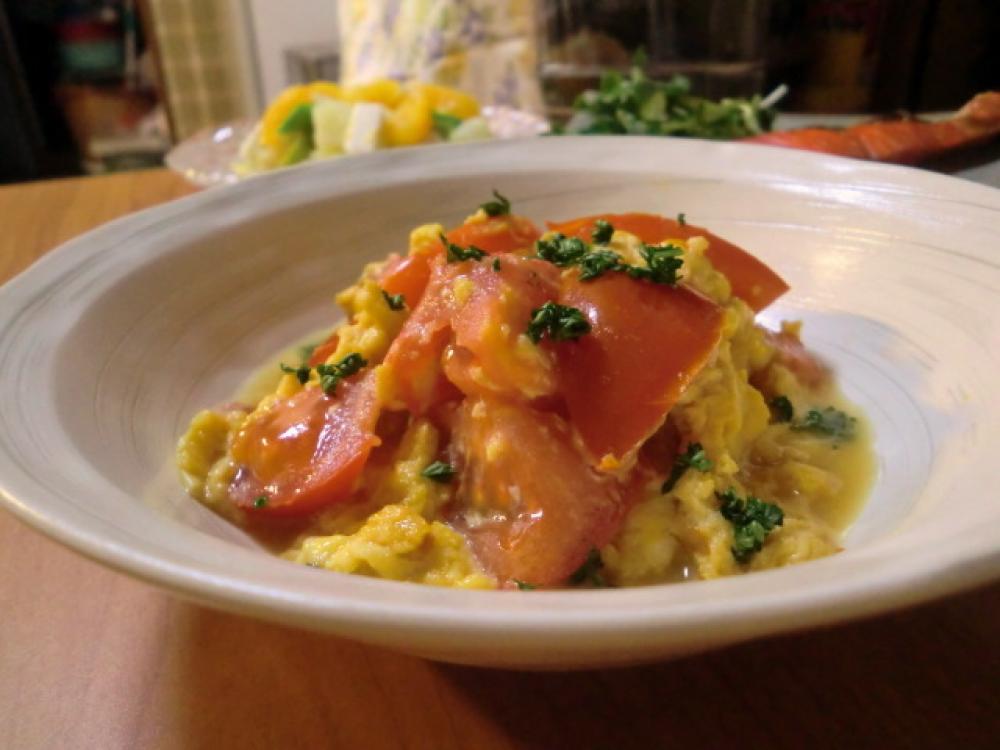 トマトは、ヘタを取り、1口大のザク切りにします。