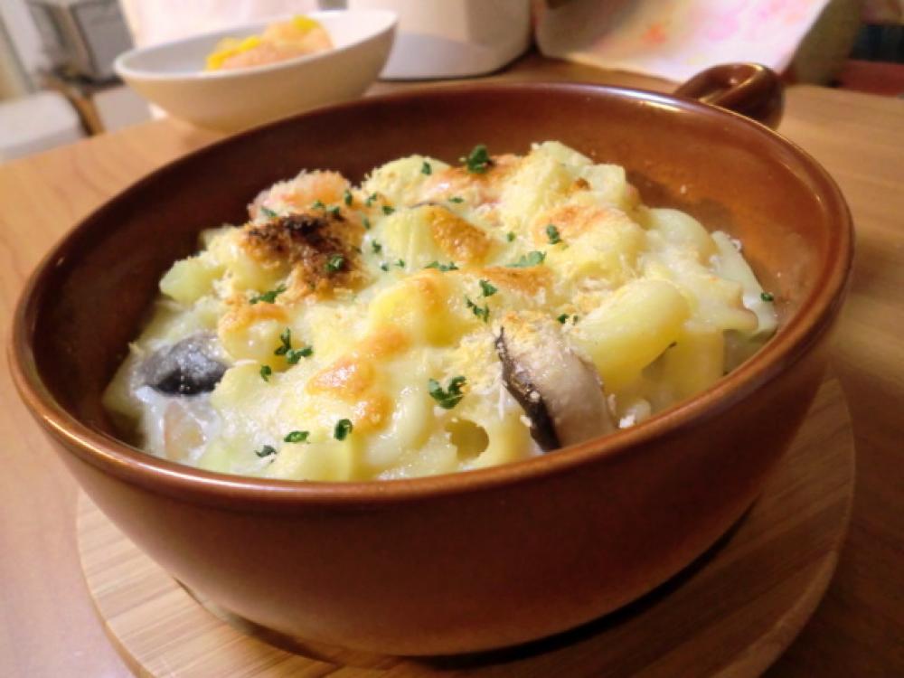 バターを塗った耐熱容器に7を入れ、チーズをちらし、その上からパン粉をふりかけます。