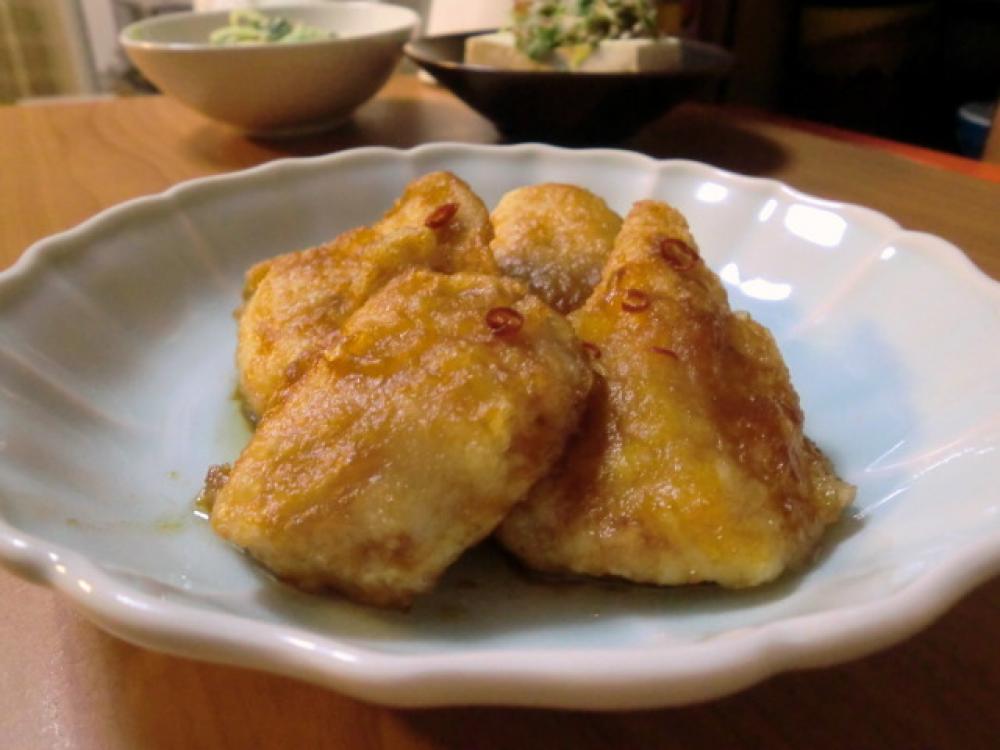 1の鶏肉に小麦粉をまぶし、溶き卵をつけ、揚げ焼きにし、熱いうちに②のタレに漬け込み味をなじませます。